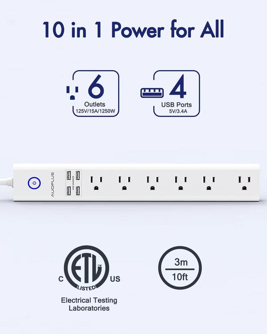 Power Strip 10Ft - Surge Protector with USB, 6 Outlet and 4 USB Charger, 10Ft Long Extension Cord Flat Plug(1250W/10A/2100J), Wall Mountable Overload Protection for Computer Home Office Dorm